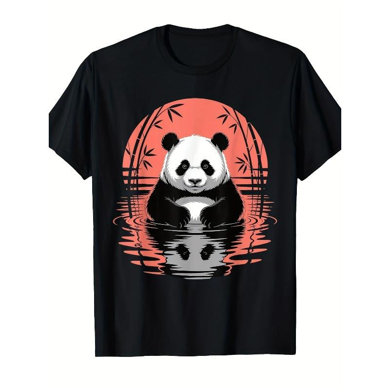 European Sizes Men's & Women's Retro Panda Bear Graphic T-Shirt, Casual Streetwear Round Neck Short Sleeve Tee with Red Sunset Panda & Rayon Design