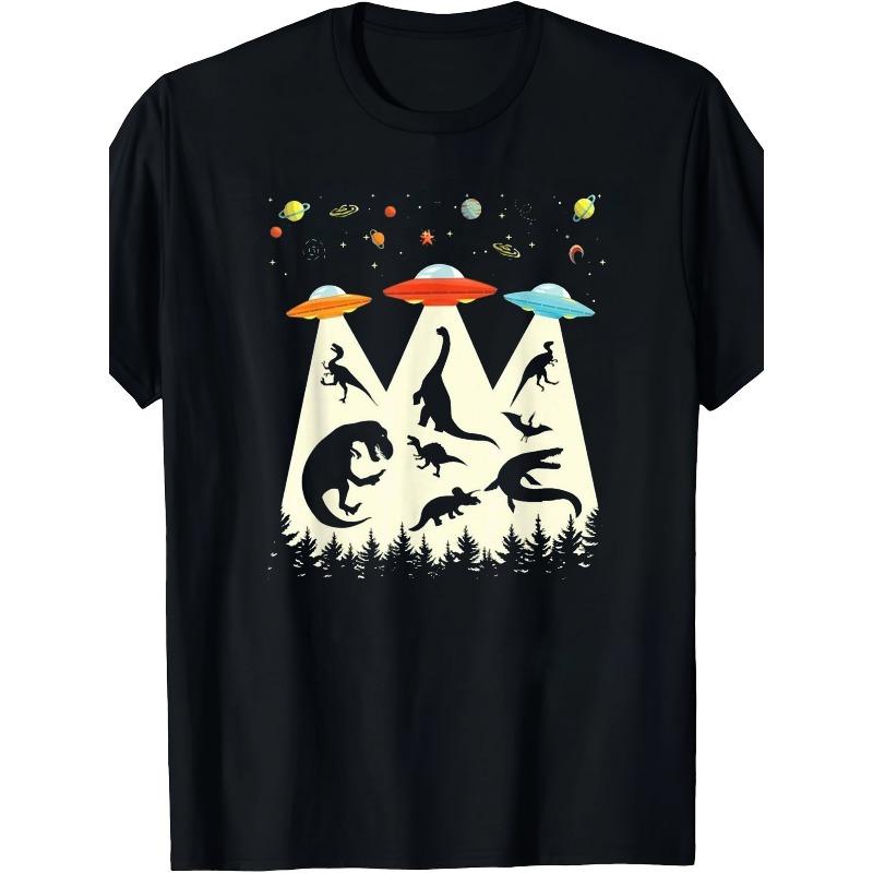 European Sizes Retro Dinosaur & UFO Graphic T-Shirt, Ideal for Parties, Festivals, Sports & Home Wear