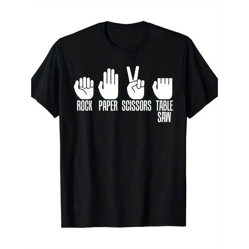 European Sizes Trendy Summer Casual Wear for Men Featuring a Crew Neck Short Sleeve Tee with a Unique Digital Print of a Rock-Paper-Scissors Table Saw