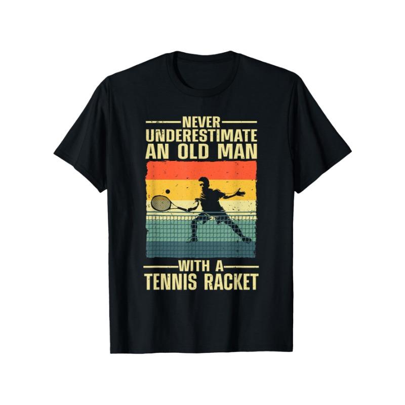 Mens Fun Tennis Pattern Tshirt Never Underestimate a Man Holding a Tennis Racket Slogan Retro Tennis Player Design