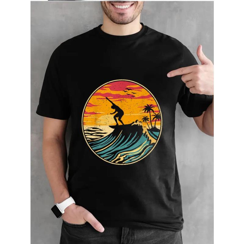 Mens Plus Size Black Tshirt with Tropical Surfing and Beach Pattern Print Mens Surfing and Surfboard Design Loose Casual