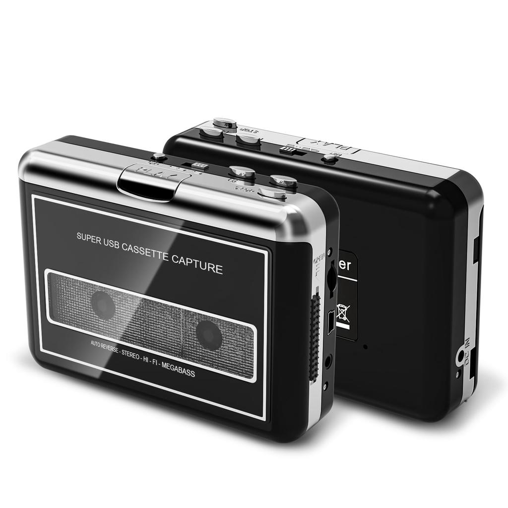 "Portable Cassette Player - Play Cassette Tapes Anywhere" This lightweight and compact cassette tape player features a 3.5mm headphone jack, allowing you to enjoy cassette tape music on the go. Its built-in cassette digitizing function makes it a convenient cassette player for travel or business trips.