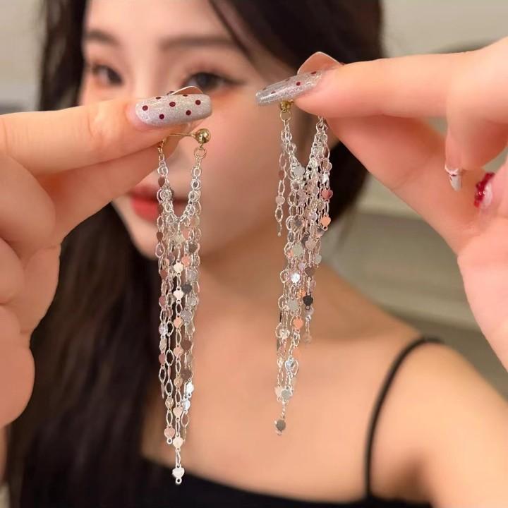Galaxy Waterfall~ Love Fringed Long Earrings Temperament Earrings Autumn and Winter Round Face Thin Bulingbuling Ears