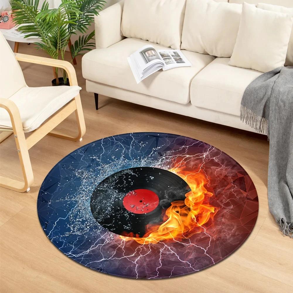 Crystal Velvet Water Fire Round Rug, CD Record Print Non Slip Floor Mat for Living Room, Bedroom, Home Decor, Circle Area Rug