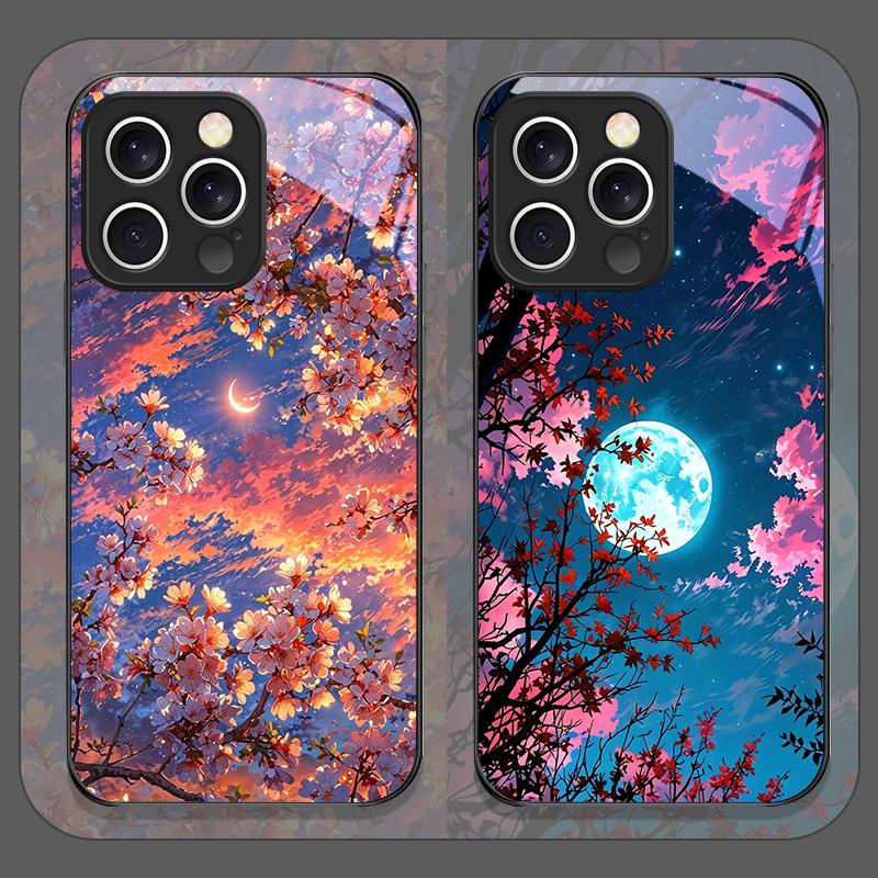 Moon Cherry Blossom Pattern Scenery Tempered Glass Phone Case for iPhone 17 16 Pro Max 15 14 13 12 11 Mini XS XR 7 8 Plus Cover