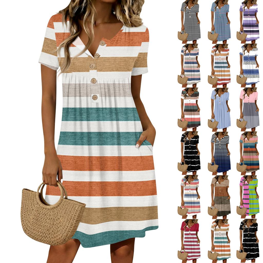 Women's Fashion Striped Print Round Neck Short Sleeve Buttoned Casual Dress