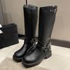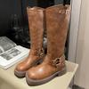 Fashion Belt Buckle Gothic Boots for Women Brown Thick Heels Knee High Combat Boots Woman Plus Size 42 Punk Long Botas Female