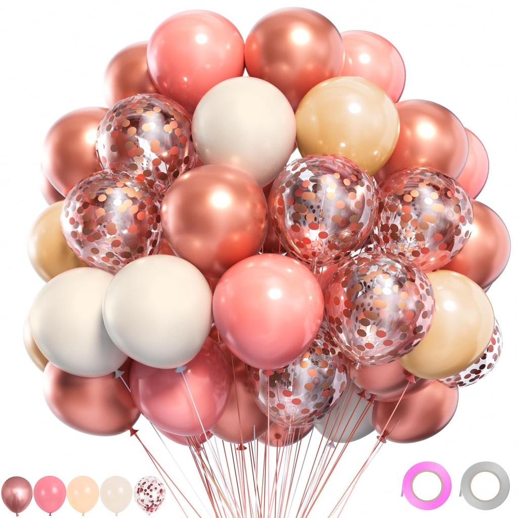🌞 [Balloon Set Contents] 12 rose gold balloons, 12 pink balloons, 12 white balloons, 12 skin-tone balloons, 12 rose gold confetti balloons, 2 ribbons (approx. 20m), 40 double-sided wall stickers. Size: Please refer to the photo.