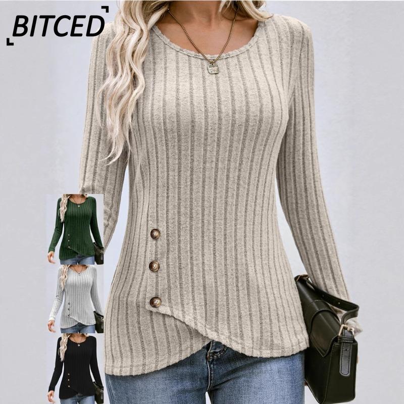 BITCED Women's Fashion Casual Solid Color Print Long Sleeve O Neck Blouses & Shirts