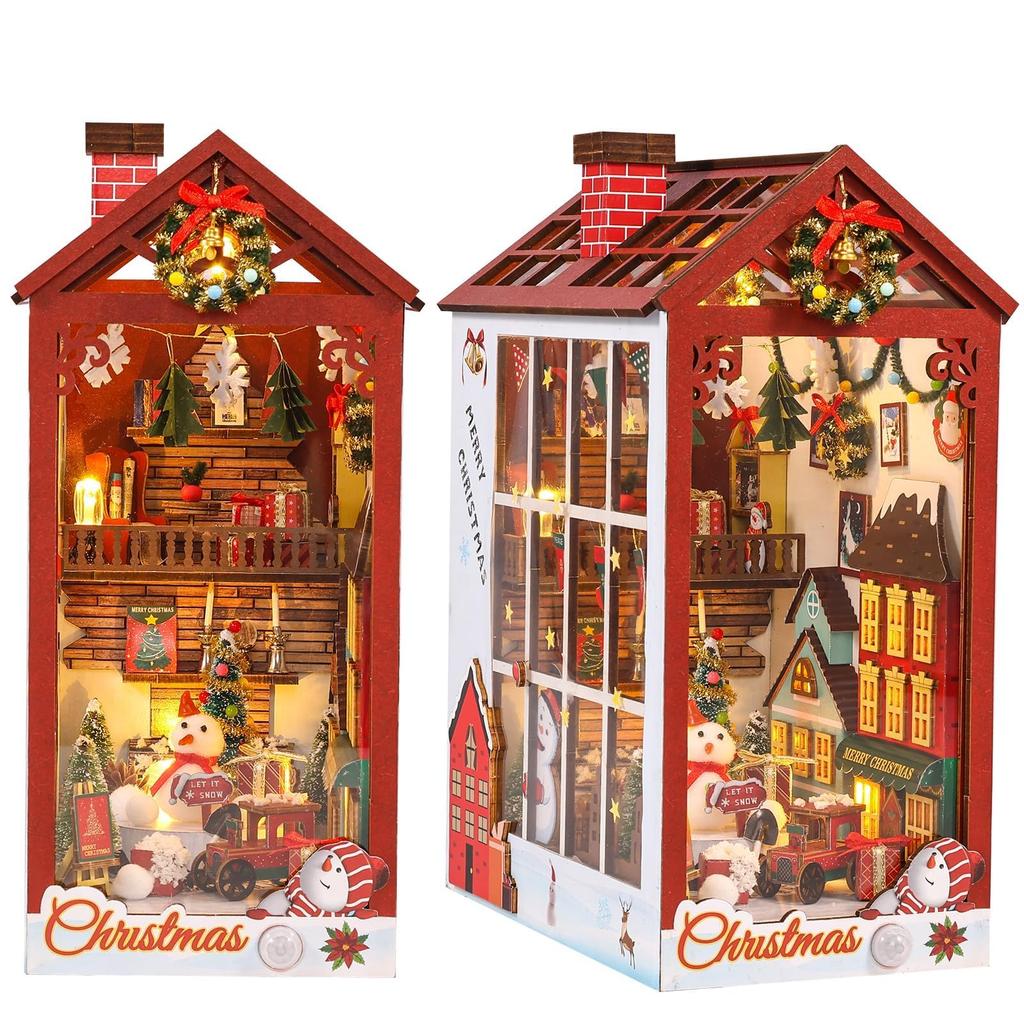 Miniature Dollhouse Christmas Wooden Puzzle Miniature House Kit with Bookshelf Music Box and Sensor Christmas 3D DIY Craft Beginner Adult Birthday