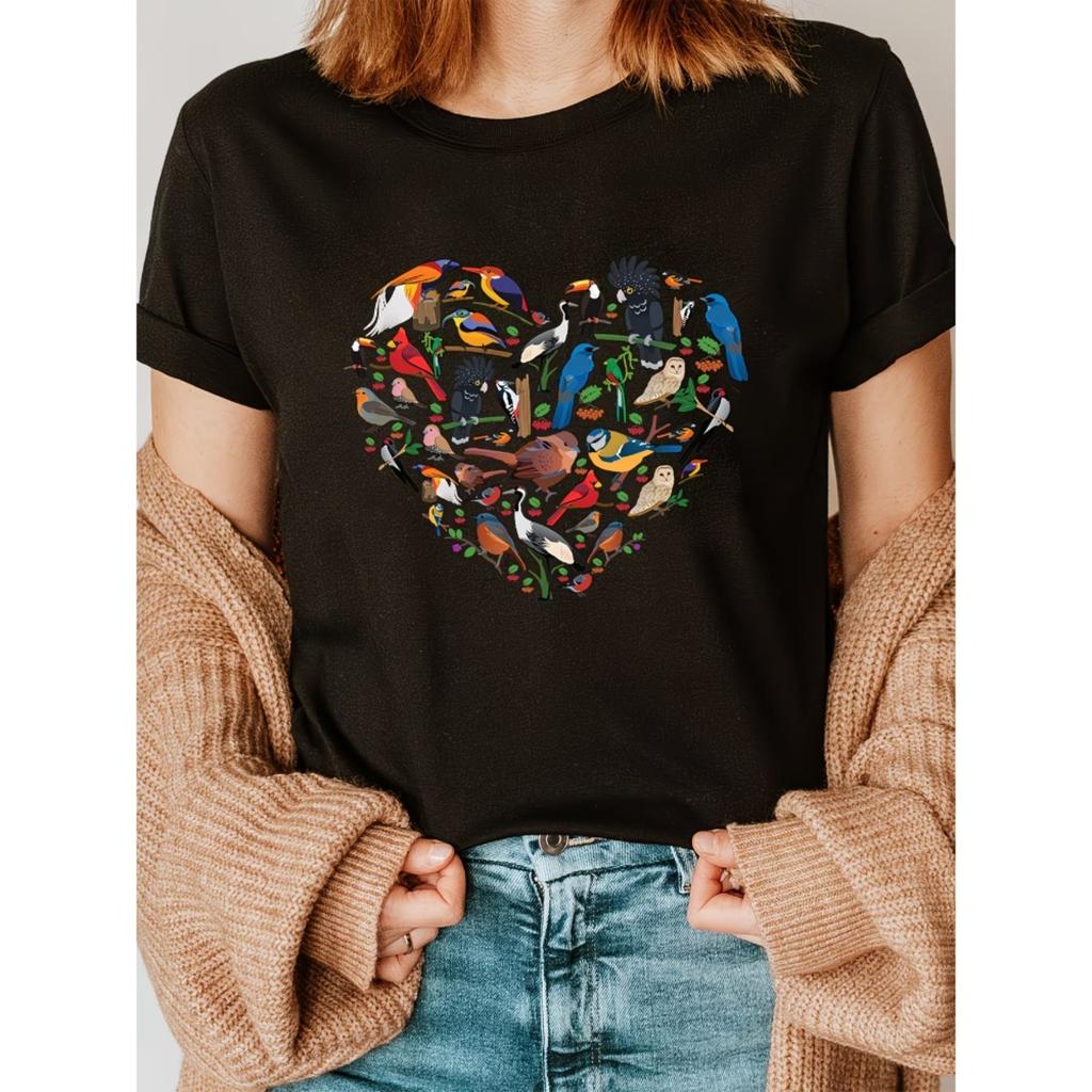 Bird Lover's Heart Birdwatching Letter Print T-shirt, Short Sleeve Crew Neck Casual Top for Summer & Spring, Women's Clothing
