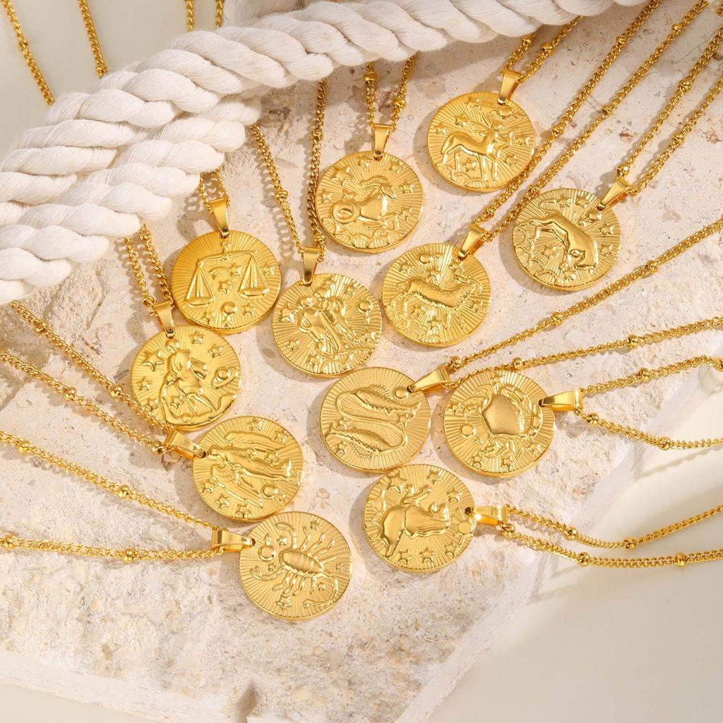 Stainless Steel Zodiac Constellation Necklace for Women, Amulet Round Coin Pendant Vintage Jewelry Birthday Gift