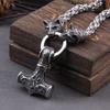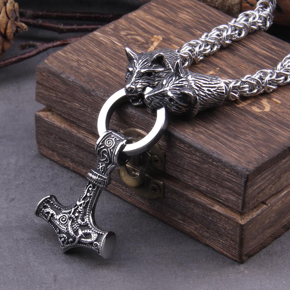 Stainless Steel Wolf Head Thor Hammer Mjolnir Viking Necklace Handmade Chain with Wooden Box Gift for Boyfriend