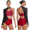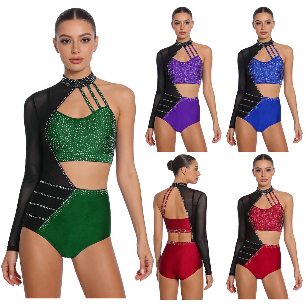 S-XXL Womens Gymnastics Leotard Bodysuit Rhinestone Color Blocking Asymmetrical Hollow Out Jumpsuit Figure Skating Tango Dancewear