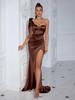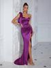This elegant evening dress features a sophisticated off-shoulder design and a chic slit, perfect for formal occasions. Made from luxurious satin, it offers a sleek and smooth appearance that enhances its timeless style. The solid color adds a touch of classic elegance, making it a versatile choice for any special event. Comfortable and stylish, this dress combines a modern silhouette with a touch of glamour.