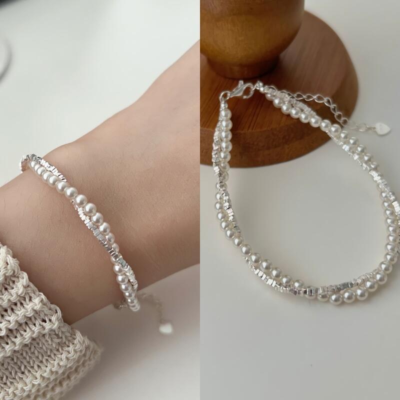 Women's S925 Silver Pearl Silver Twist Layered Bracelet