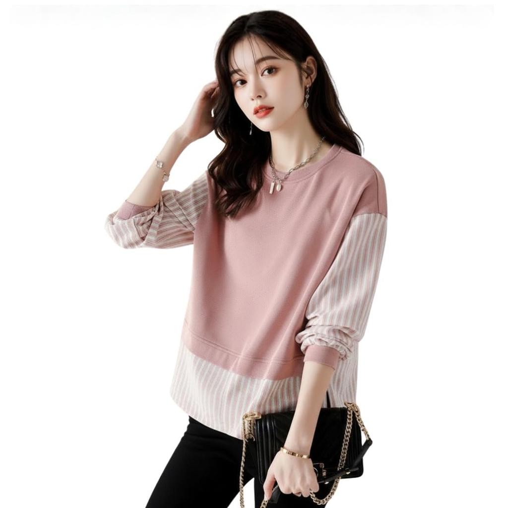 Introducing this layered striped top in a muted pink tone. The round neckline creates a clean, flattering neckline and slims your face. The striped shirt fabric on the hem and sleeves gives this top a sophisticated, cute look. Its sophisticated, sophisticated look makes it easy to coordinate with any outfit, making it a must-have for any sophisticated woman. The layered, docked design combines trendiness with warmth, making it an excellent piece. The soft, comfortable material is comfortable to wear, while the shirt fabric on the sleeves and hem adds a stylish touch. It's easy to put on and take off, and doesn't feel too restrictive, making it a relaxed, stress-free pullover. It's a versatile piece that can be worn throughout the seasons, from spring to fall and winter. It's useful for both work and play, so having one in your wardrobe will expand your wardrobe. It's versatile and pairs perfectly with any style! Its matching set-up style adds a touch of sophistication. The moderate crew neck makes the décolleté look beautiful, which is a nice point ◎ The soft material with a moderate sheen gives it a luxurious feel while still being casual.