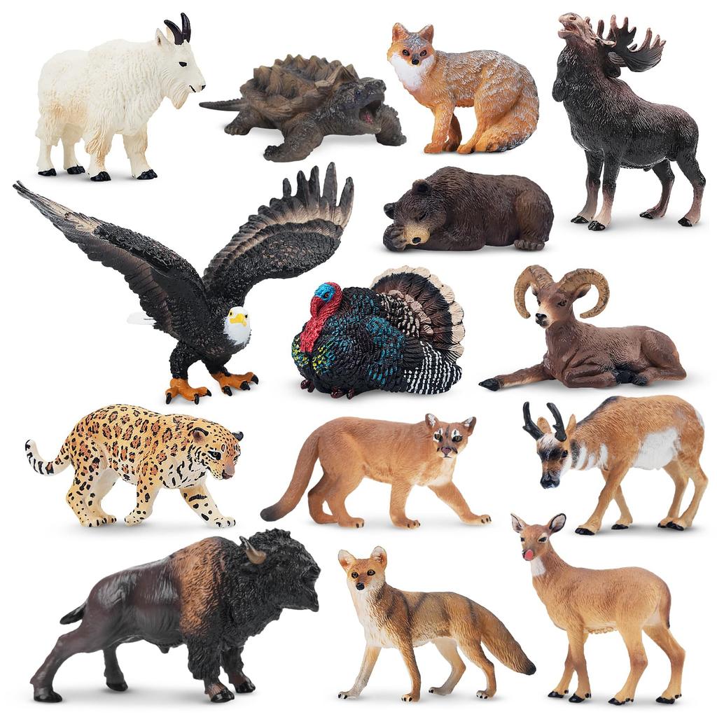 TOYMANY 14-Piece Mini North American Wild Animal Figure Set, Realistic Jungle Animal Models, Brown Bear and Elk Models, Popular Toy, Birthday Gift,