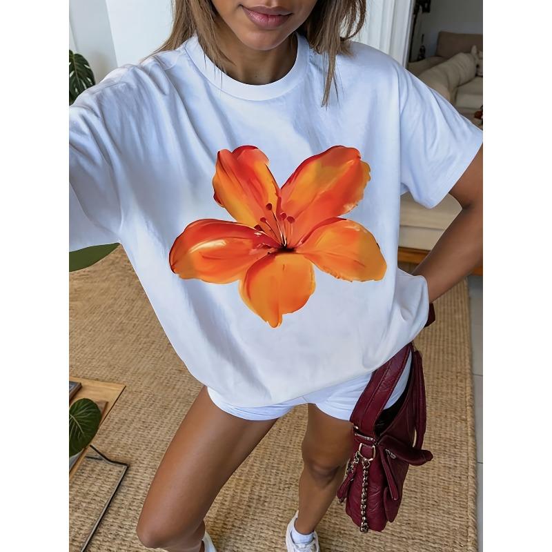 Women's White Orange Yellow Floral Print Tee Relaxed Fit Short Sleeve All-Season Machine Washable Versatile Casual Trendy Top