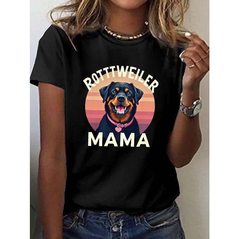 European Sizes Rottweiler Mama Dog Illustration Print T-shirt, Short Sleeve Crew Neck Casual Top for Summer & Spring, Women's Clothing