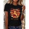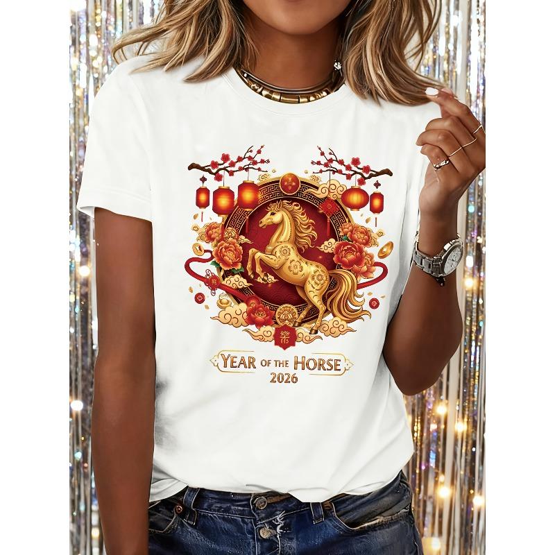 European Size Women's Round Neck Short Sleeve T-Shirt, 2026 Year of The Horse Golden Horse Peony Lantern Print, Traditional Auspicious Print Elements