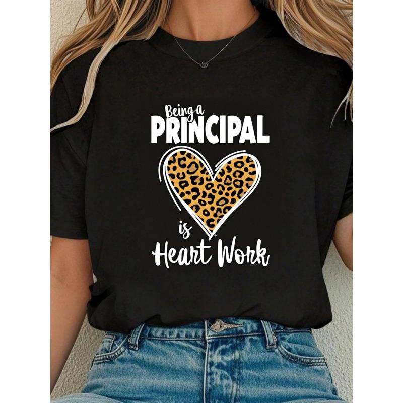 European Size Women'S Black Short Sleeve T-Shirt - Principal Heart Leopard Print & "Being A Principal Is Heart Work" Slogan,Round Neck Graphic Tee