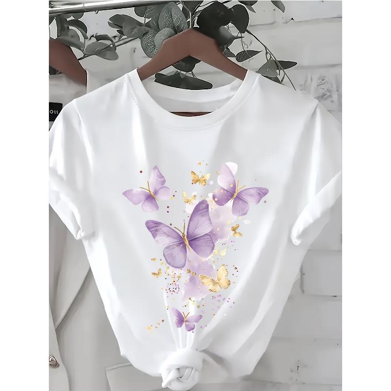 European Size 2026 Spring Summer Women'S Crew Neck Butterfly Print Short Sleeve Casual T-Shirt, Soft and Breathable, Colorful Design for Everyday Wear