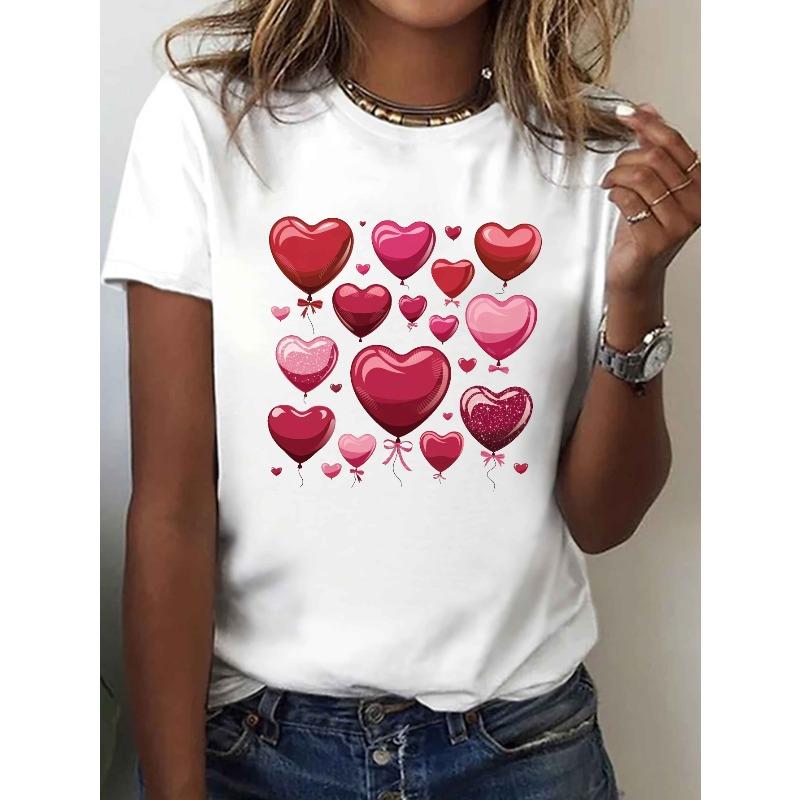 European Size Women'S Glossy Heart Balloon Print T-Shirt | Short Sleeve Round Neck , Glossy Balloon and Heart Design, Medium Elasticity