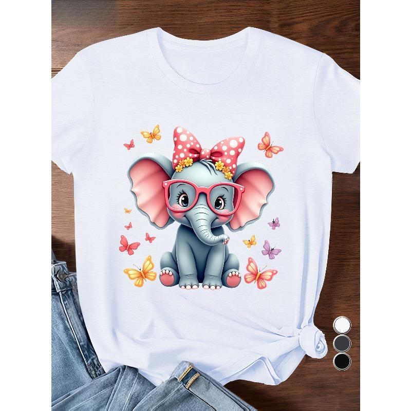 European Size Women's Plus Size Cute Elephant Graphic Short Sleeve T-Shirt - Soft Polyester, Round Neck, Casual Style, Machine Washable