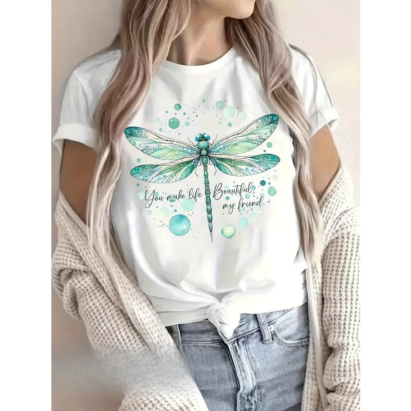European Size Short-Sleeved T-Shirt with a Pure Dragonfly Pattern Print