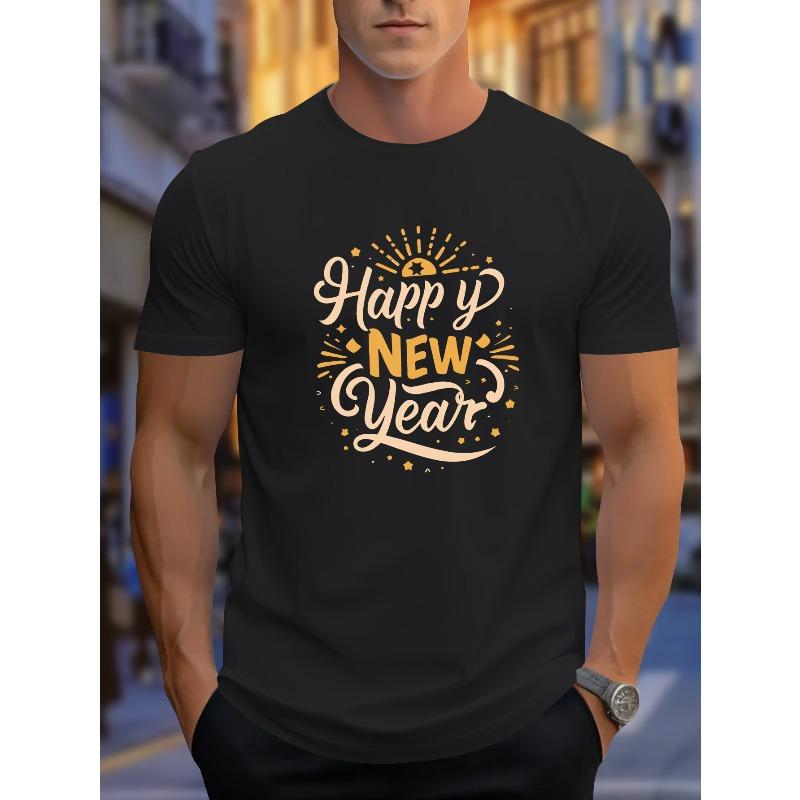 European Sizes 2026 Happy New Year T-Shirt | American European Style Print Casual Sports Outdoor Men'S Short Sleeve T-Shirt, Slight Stretch Fabric