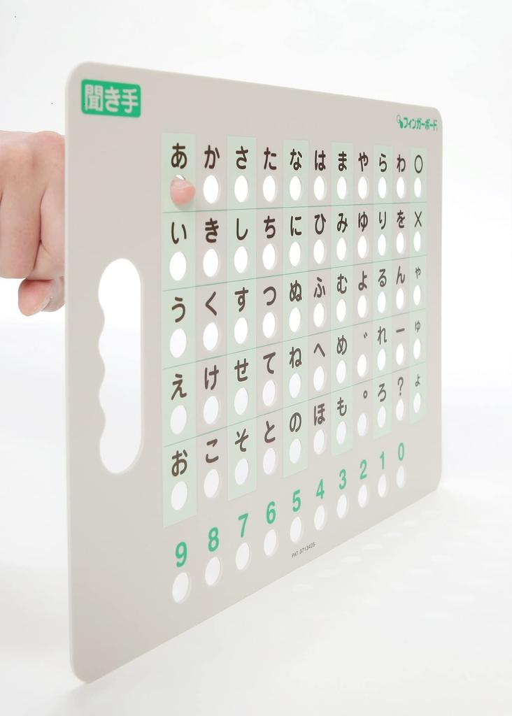 The "Fingerboard" is a face-to-face communication aid for individuals who have difficulty communicating verbally due to factors such as speech disorders, stroke, tracheotomy, or advanced age. By pointing to the letter holes, they can form words and communicate face-to-face with their caregiver. The Fingerboard features the same letters and numbers displayed in the same position on both sides, with letter holes below each letter for confirmation. Simply pointing at the letter holes allows users to easily express what they want to say or convey their thoughts. No training is required; anyone, from children to seniors, can quickly communicate and converse in writing.