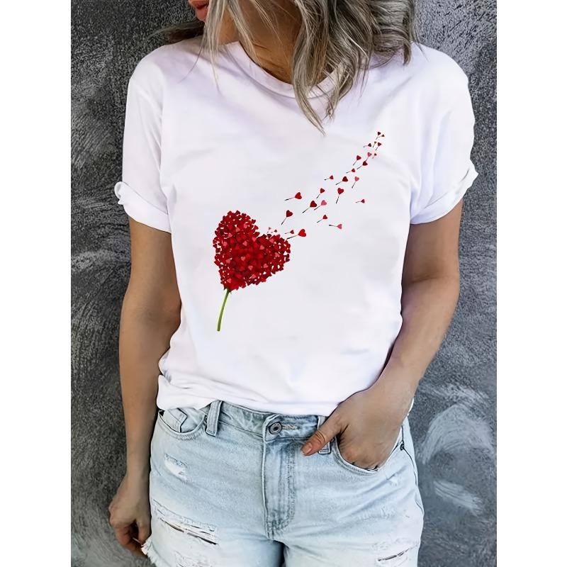 European Size Heart Print Crew Neck T-shirt, Casual Short Sleeve Top for Spring & Summer, Women's Clothing