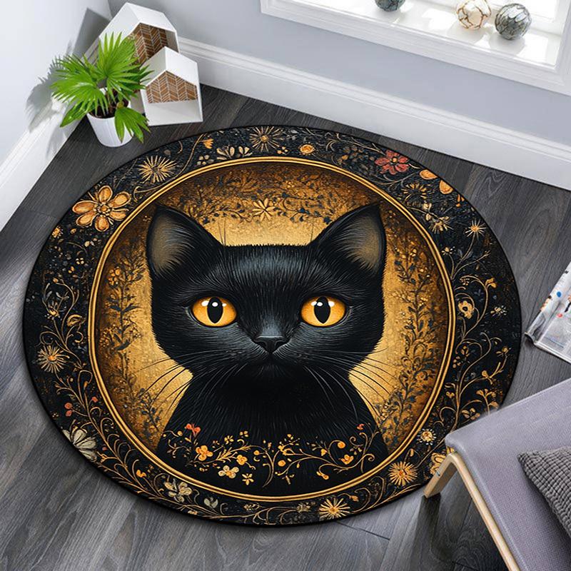 Golden Framed Black Cat Round Area Rug,Carpet Rug for Living Room Bedroom Sofa Playroom Decor,Non-slip Floor Mat
