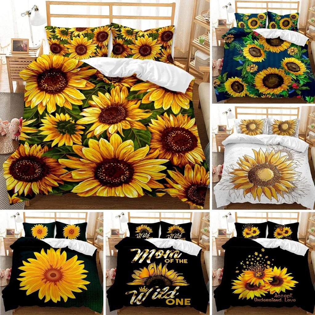 Sunflower Duvet Cover Set Yellow Flower Bedding Set Sunflower Botanical Floral Garden Bloom Print On Black Polyester Quilt Cover