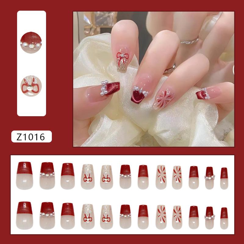 Red French Fireworks Flash Pearl Bow Cat Eye European and American Ins Style Atmosphere Detachable Manicure 24 Pieces