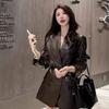 Leather Jacket Autumn New Casual Retro Temperament Waist Strap Medium and Long Suit Collar Leather Jacket Fashion
