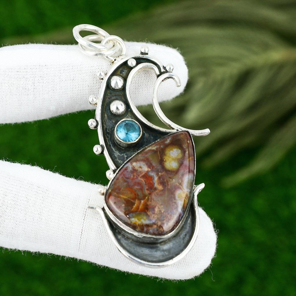 Pear Seame Agate Gemstone Blue Topaz Birthday Ethnic Pendant 925 Sterling Silver
