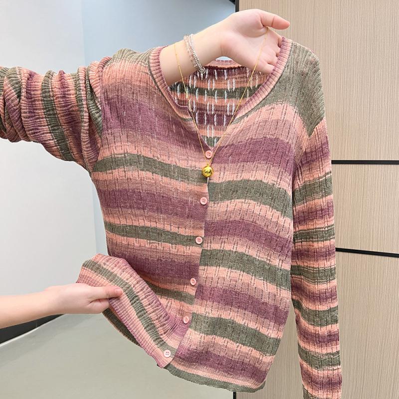 Autumn and Winter Rainbow Striped Long-sleeved Knitted Cardigan Sweater Jacket Top