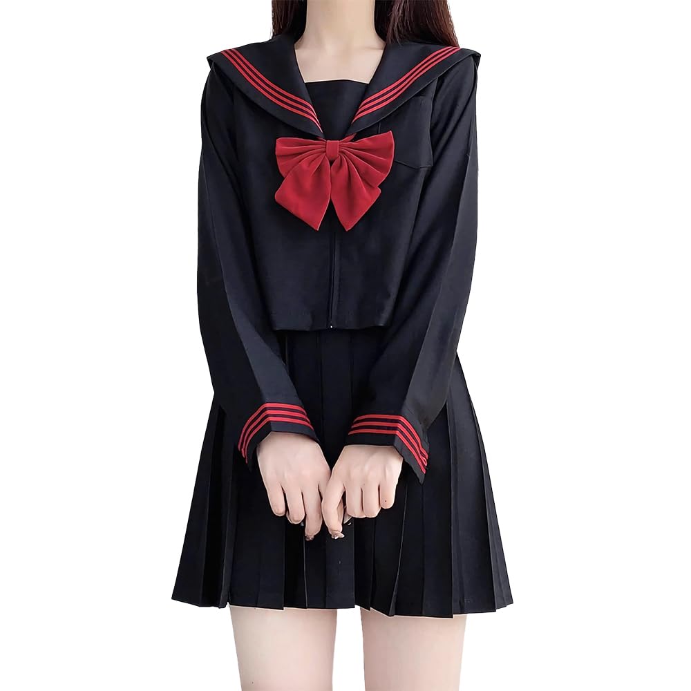 GSYCL Sailor Long Short Red Set for High School JK Top and Bottom Halloween School Plus Cute Sleeve Uniform, Black, Sleeve, Sleeve, Bow, 3-Piece