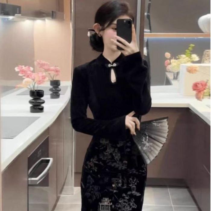 Black Velvet Cheongsam Dress for Women - Young, Trendy Autumn/Winter Style