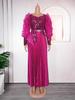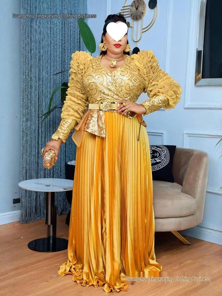 This stunning evening gown is designed to celebrate and enhance your curves with its elegant, plus-size fit and high-waisted silhouette. Adorned with an exquisite array of rhinestones, beads, and sequins, it exudes a modern flair with a touch of traditional African style. The intricate beadwork adds a touch of luxury and sophistication, making it perfect for special occasions where you want to make a memorable impression. Crafted with meticulous attention to detail, this gown promises to add a dazzling sparkle to your evening attire.