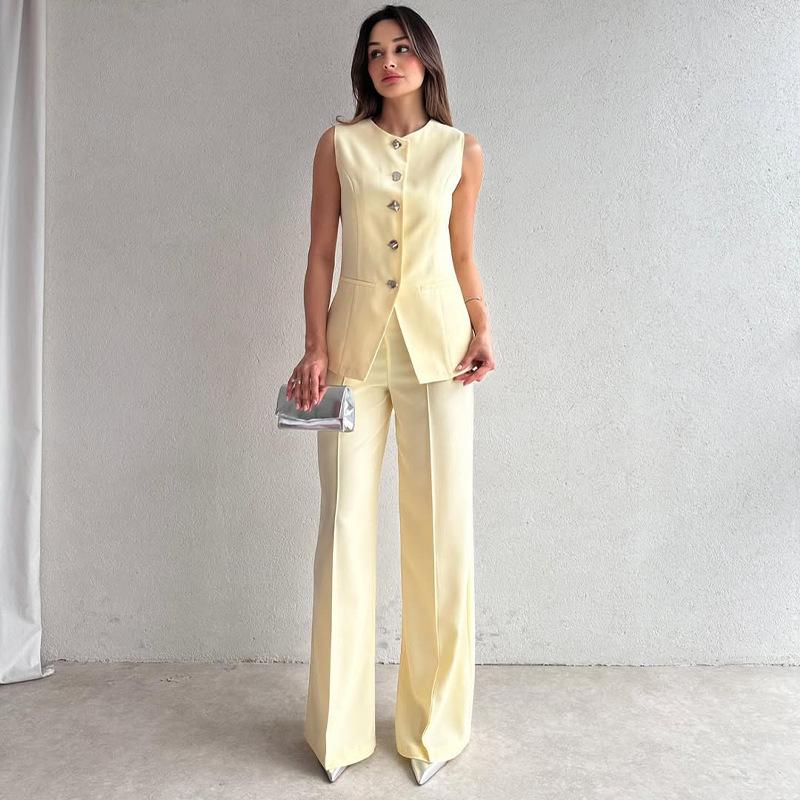 Introducing a chic and comfortable casual set designed for the modern woman. This ensemble features a sleek sleeveless top with button detailing, paired with elegant straight-leg pants. Crafted from quality polyester, the set offers a soft and durable feel, ensuring lasting wear. With its solid color design, this outfit is versatile and perfect for various occasions, while the sportive style adds a contemporary touch to your wardrobe. Ideal for those who appreciate a seamless blend of style and comfort.