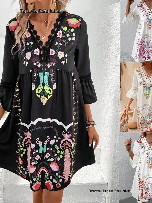 This elegant Women's Summer V-Neck Lace Patchwork Casual Printed Dress is perfect for sunny days and casual outings. Crafted from soft polyester, it offers a lightweight and breathable feel, ensuring comfort throughout the day. The dress features a flattering V-neckline and intricate lace patchwork that adds a touch of femininity and sophistication. Its eye-catching print makes it a versatile piece, suitable for brunches, beach outings, or casual gatherings.