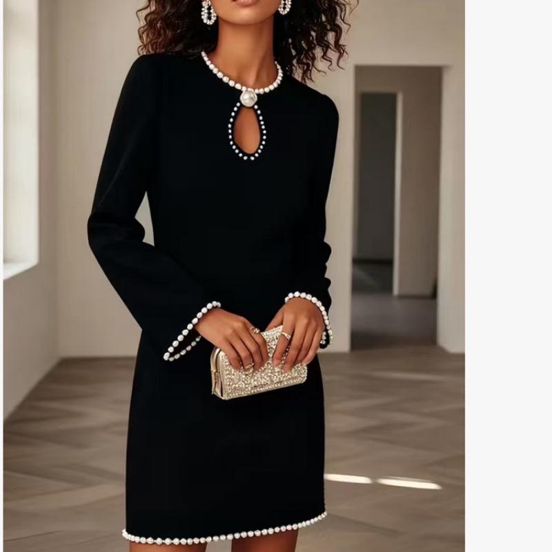 Elegant Solid Color Slim Fit Dress with Hollow Neckline & Pearl Detail - Long Sleeve Short Skirt for Spring & Autumn.