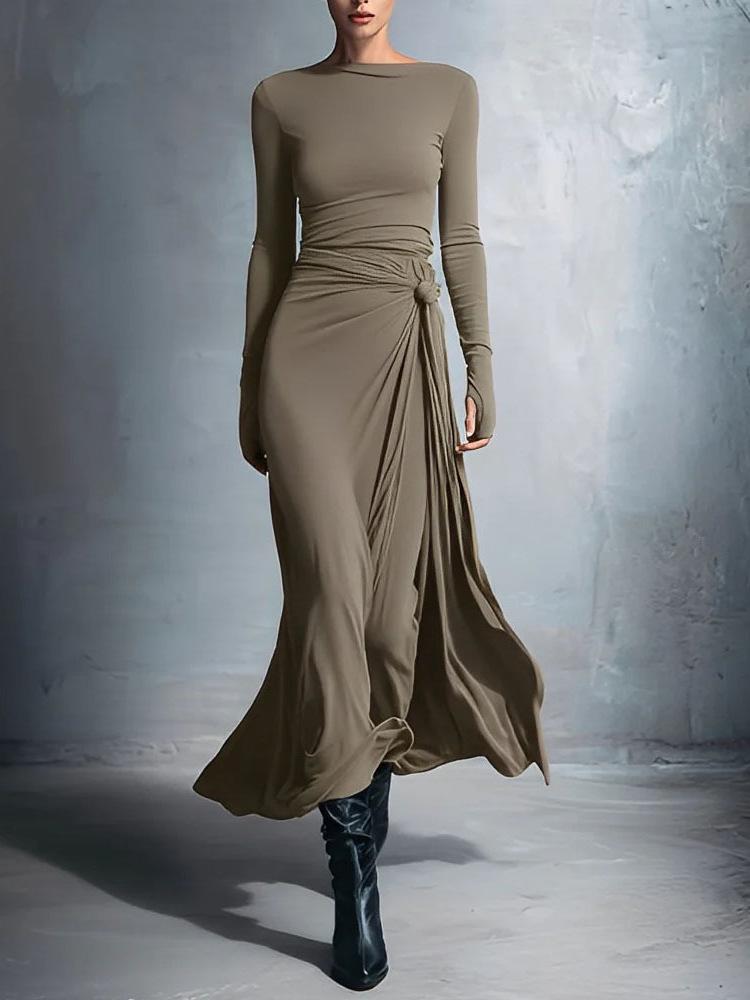 This elegant dress is perfect for the autumn and winter seasons, featuring long sleeves and a sophisticated wrap design. Crafted from a soft blend of polyester, it offers a comfortable and flattering fit with its stretchy material. The standout feature is a chic knot detail, adding a touch of style and sophistication. Available in a variety of solid colors, this dress is a versatile addition to any wardrobe, ideal for both casual outings and formal occasions.