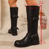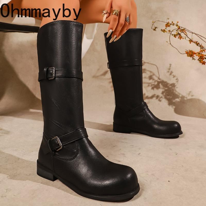 Winter Street Belt Buckle Women Knight Long Elegant Low Heel Female Slip On Knee High Top Booties De Muje