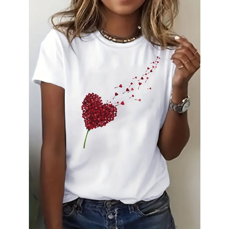European Size Women'S Heart Print T-Shirt - Soft & Comfortable Casual Crew Neck Short Sleeve Top, Perfect for Spring and Summer, Mother'S Day Gift