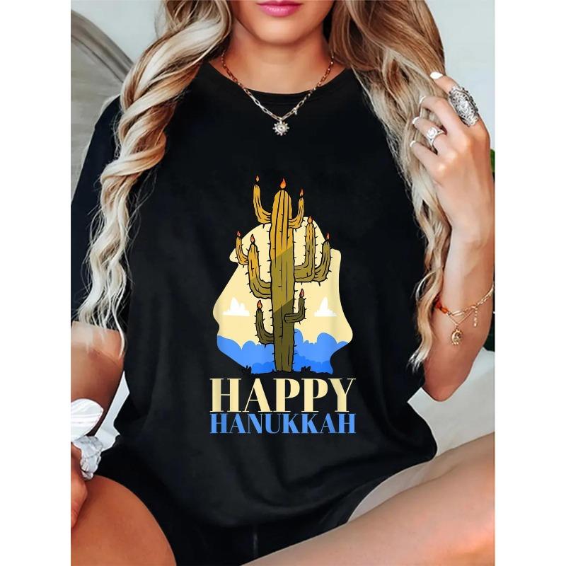 Women Plus Size Happy Hanukkah T-Shirt Black Blue Text Desert Cactus Crew Neck Jewish Festive Party All-Season Casual Machine Washable Top