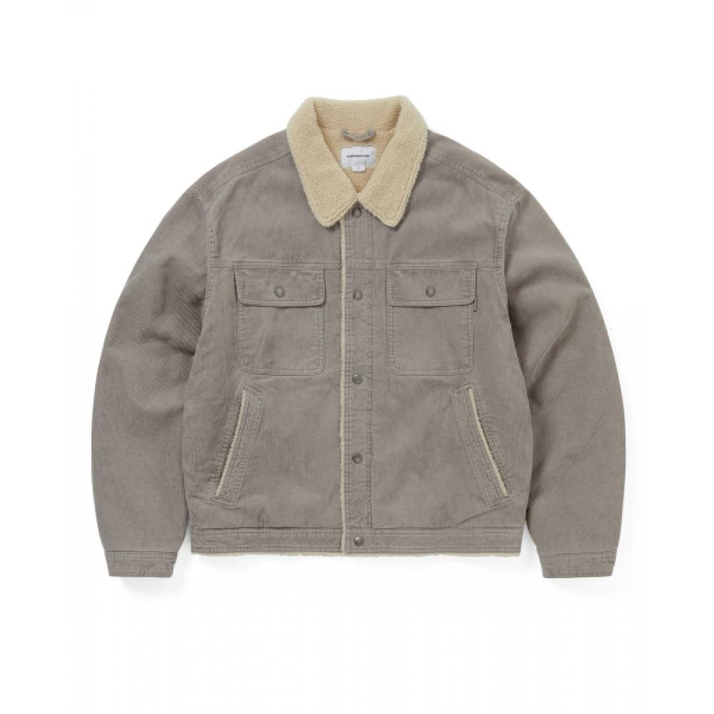 THISISNEVERTHAT Sherpa Lined Corduroy Trucker Jacket Grey is made from durable corduroy material and features a thick sherpa lining for excellent warmth. This heavy trucker jacket is perfect for cold winter weather and can be used as everyday winter wear. It is suitable for various situations, including hiking and casual outings. The design includes multiple pockets for practicality.